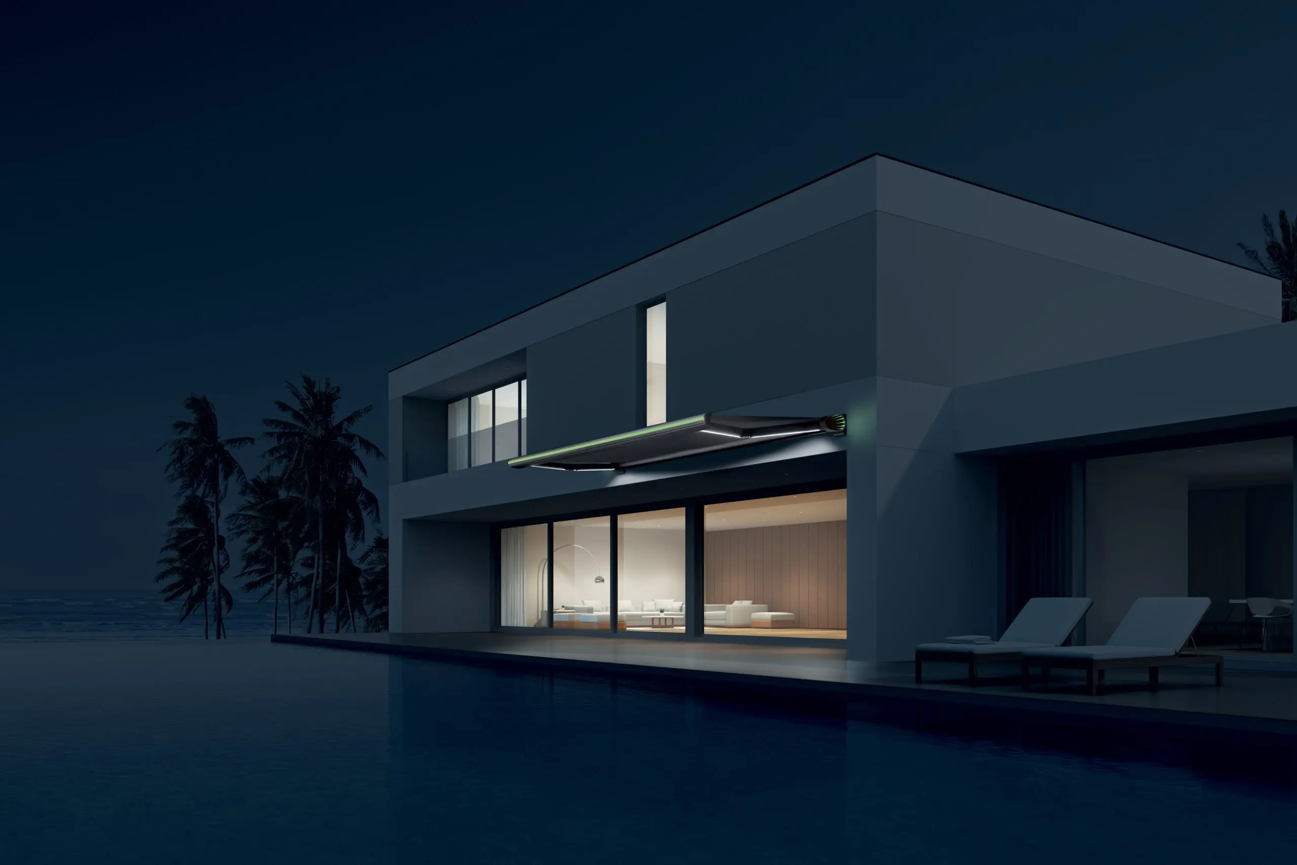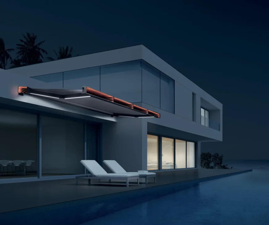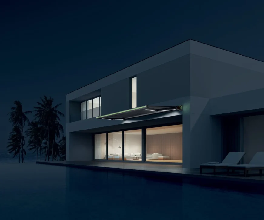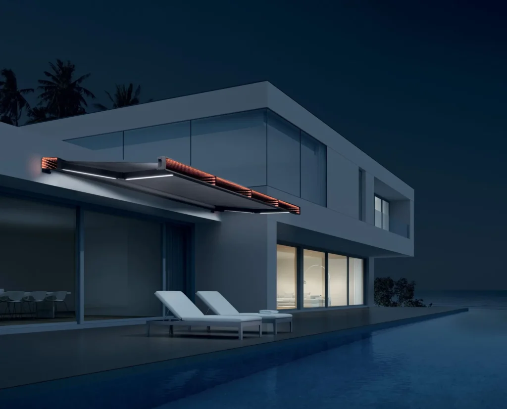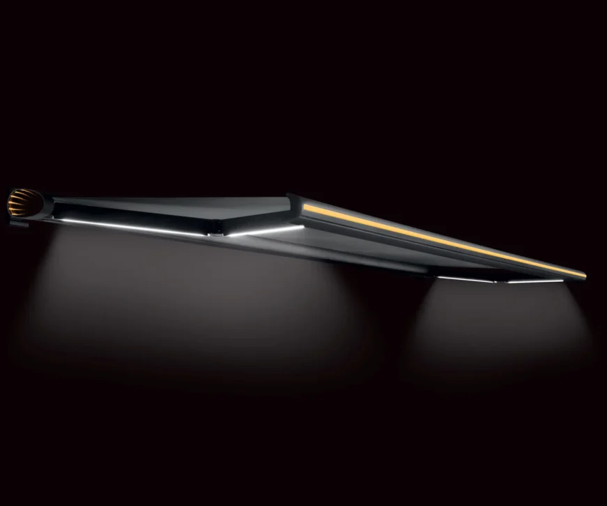 Ez a napellenző nem csak nappali, hanem esti funkcióval is bír. Míg nappal árnyékot biztosít az alatta lévőnek este a hangulatosan megvilágított teraszon ücsöröghetünk a csuklókarokba épített fehér LED fénynek köszönhetően. A fény erőssége szabályozható applikáción keresztül, vagy távirányítóval.